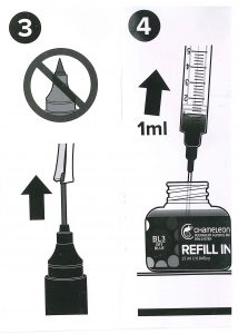 ●ペンの穴からスポイトの先を差し込み、インクを注入してください。